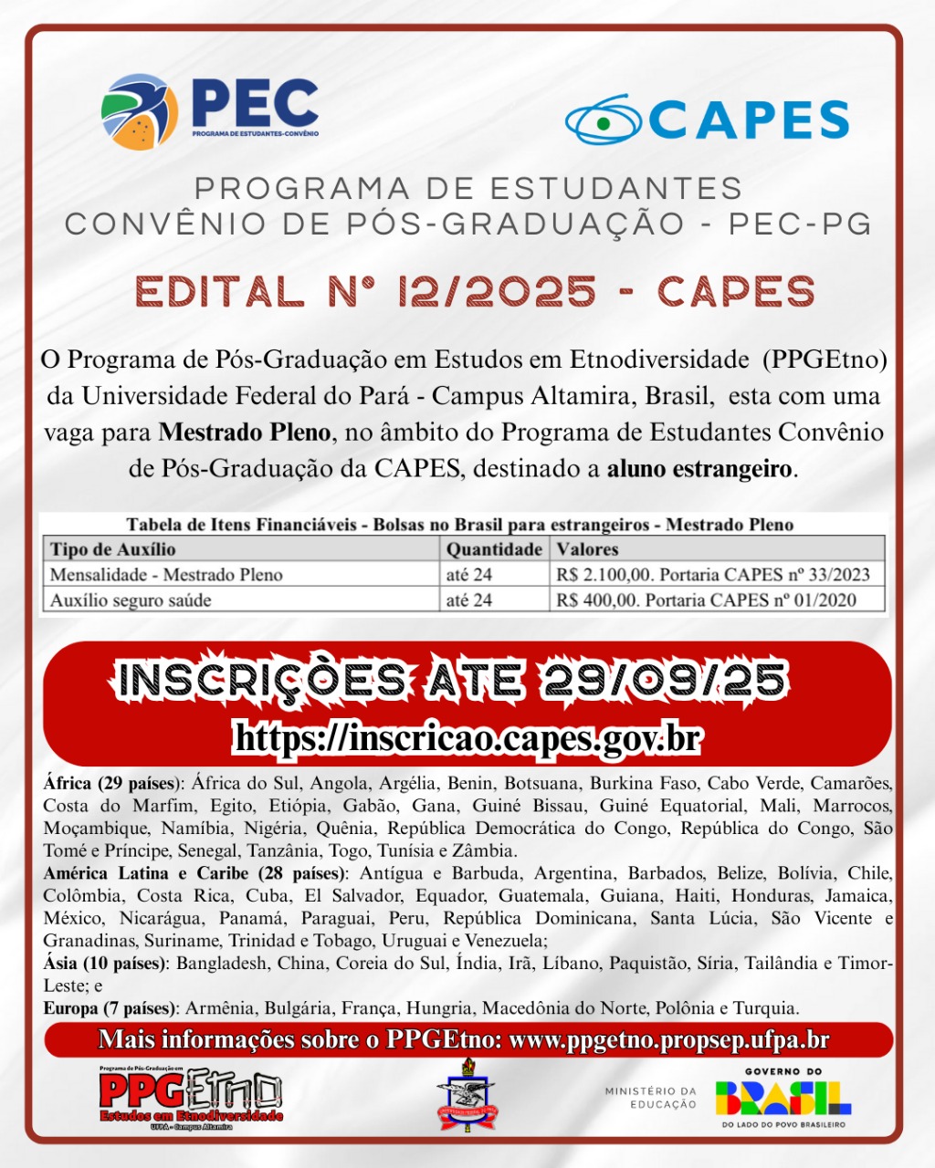 O Programa de Pós-Graduação em Estudos em Etnodiversidade (PPGEtno) da Universidade Federal do Pará - Campus Altamira, Brasil, esta com uma vaga para Mestrado Pleno, no âmbito do Programa de Estudantes Convênio de Pós-Graduação da CAPES, destinado a aluno estrangeiro.