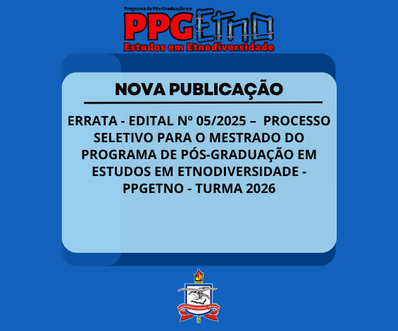 A Universidade Federal do Pará, por meio da Coordenação do Programa de Pós-Graduação em Estudos em Etnodiversidade (PPGEtno), do Campus Universitário de Altamira, torna público ERRATA do Edital nº 05/2025 – PPGEtno, que estabelece as normas para seleção de candidatos para a turma 2026 do Mestrado Acadêmico em Estudos em Etnodiversidade.
