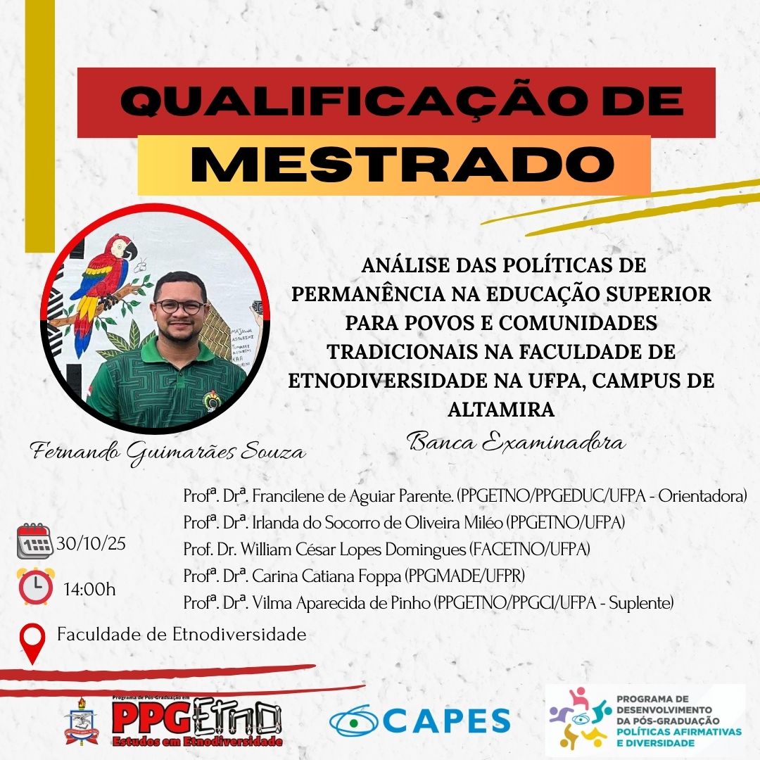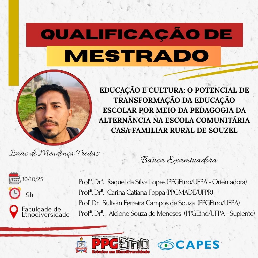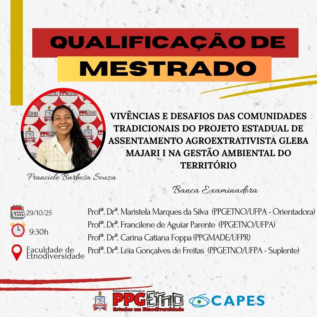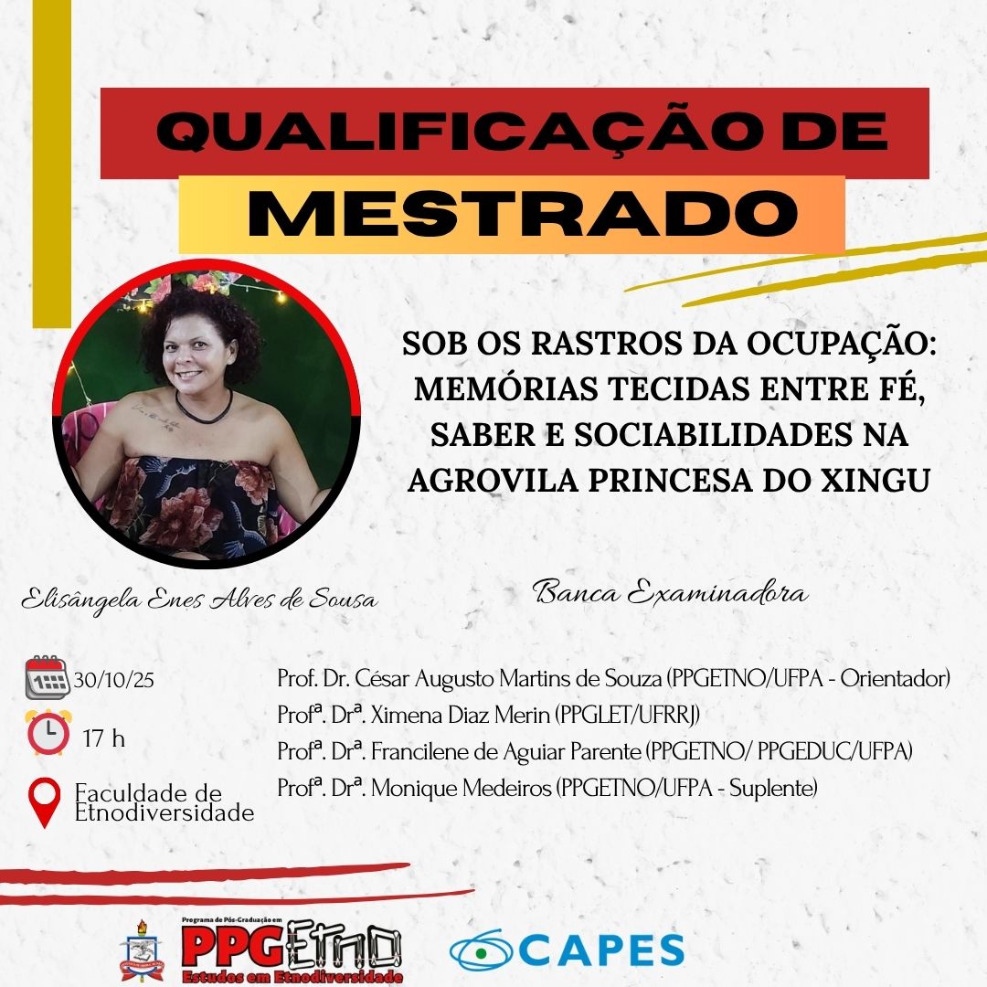 O Programa de Pós-Graduação em Estudos em Etnodiversidade (PPGEtno/UFPA) convida professores, pesquisadores, estudantes e a comunidade para participar da Qualificação de Mestrado intitulada: