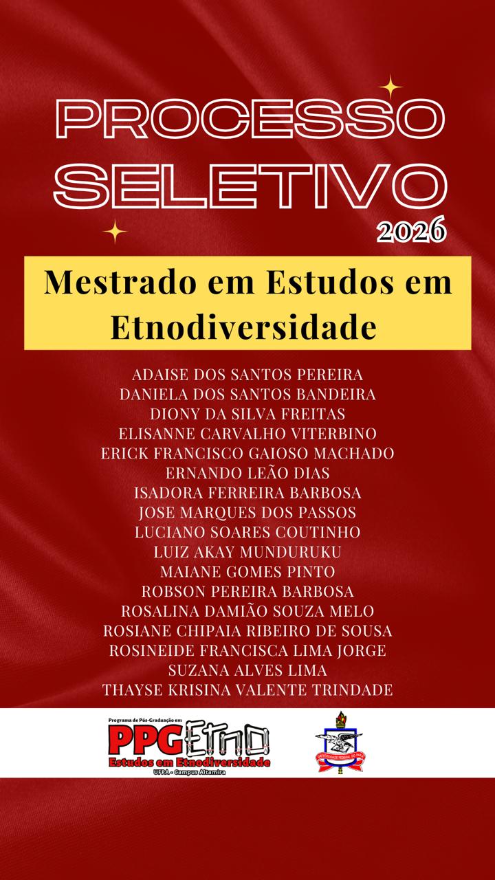 A Universidade Federal do Pará, por meio da Coordenação do Programa de Pós-Graduação em Estudos em Etnodiversidade (PPGEtno), do Campus Universitário de Altamira, torna público RESULTADO FINAL do Edital nº 05/2025 – PPGEtno, referente ao Processo de seleção de candidatos para a turma 2026 do Mestrado Acadêmico em Estudos em Etnodiversidade.