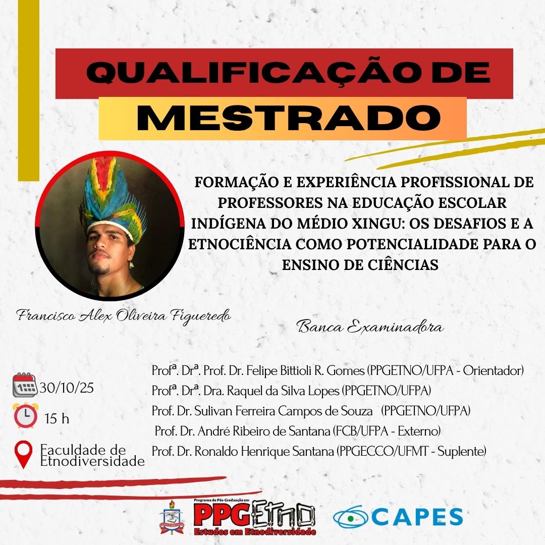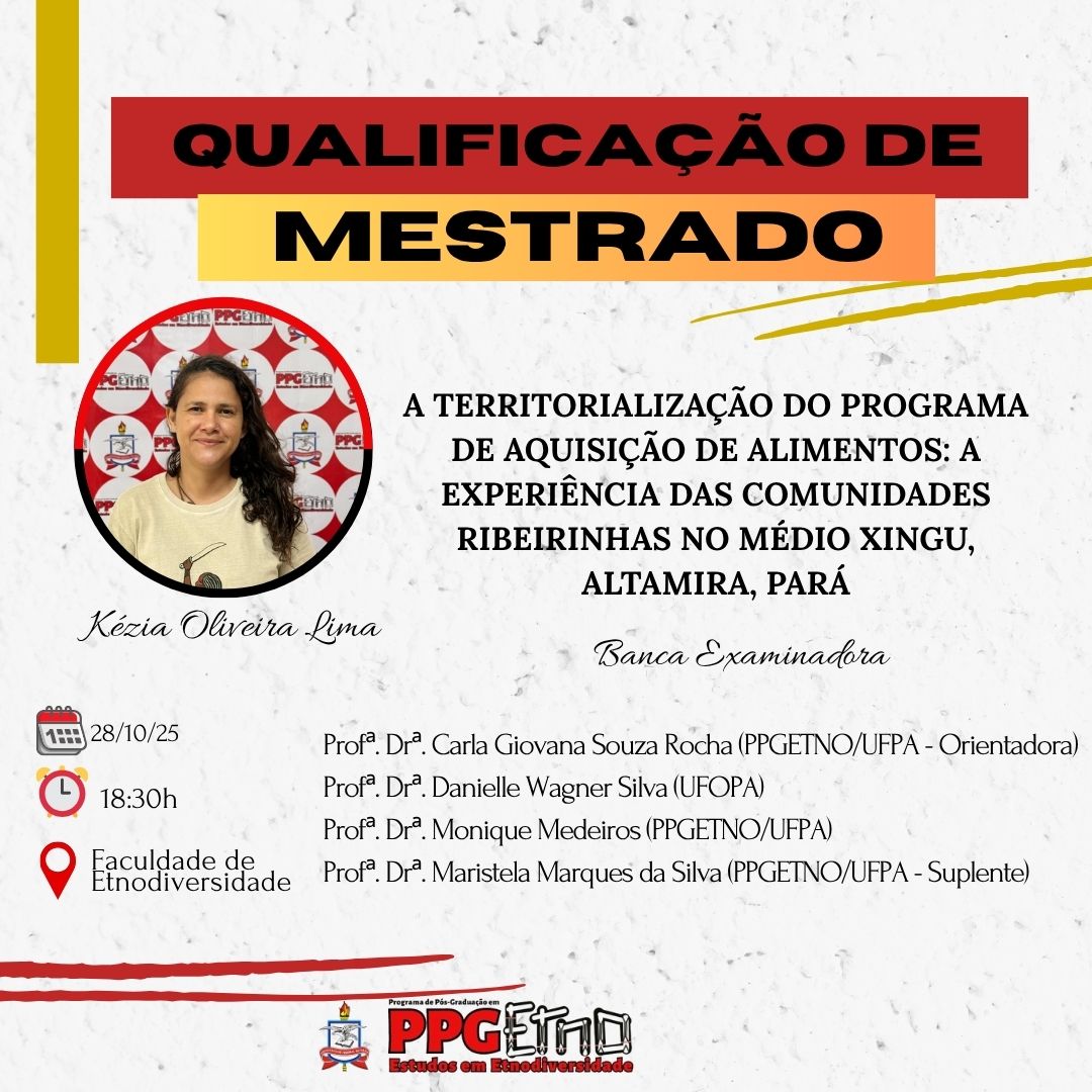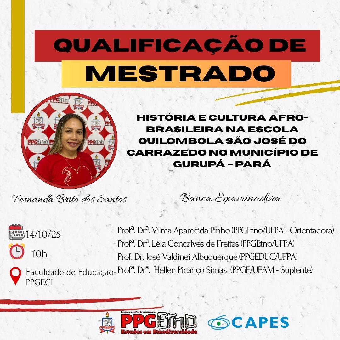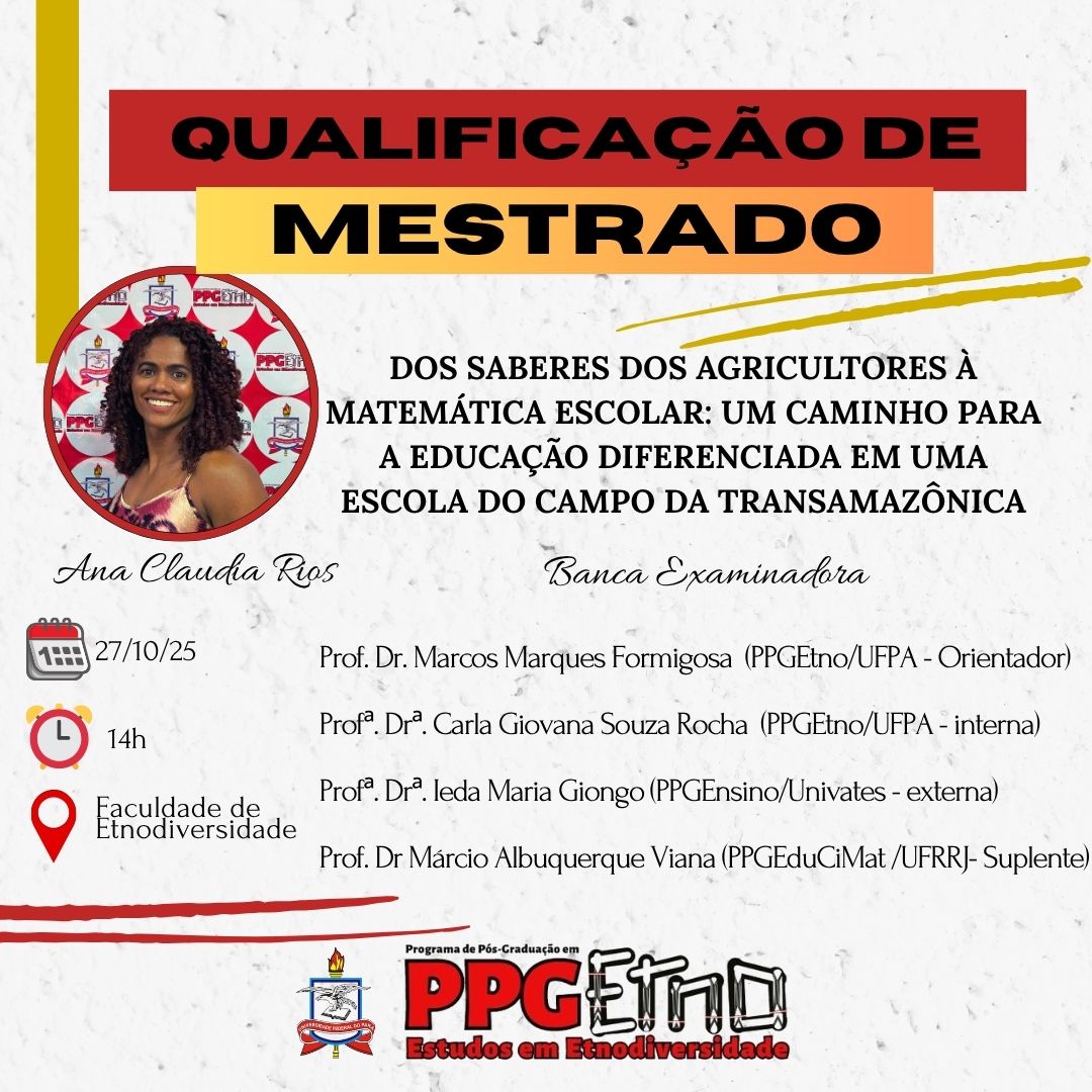 O Programa de Pós-Graduação em Estudos em Etnodiversidade (PPGEtno/UFPA) convida professores, pesquisadores, estudantes e a comunidade para participar da Qualificação de Mestrado intitulada: