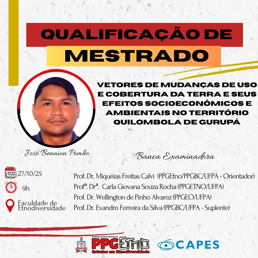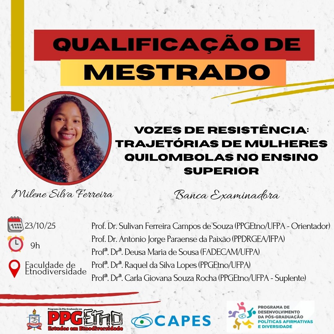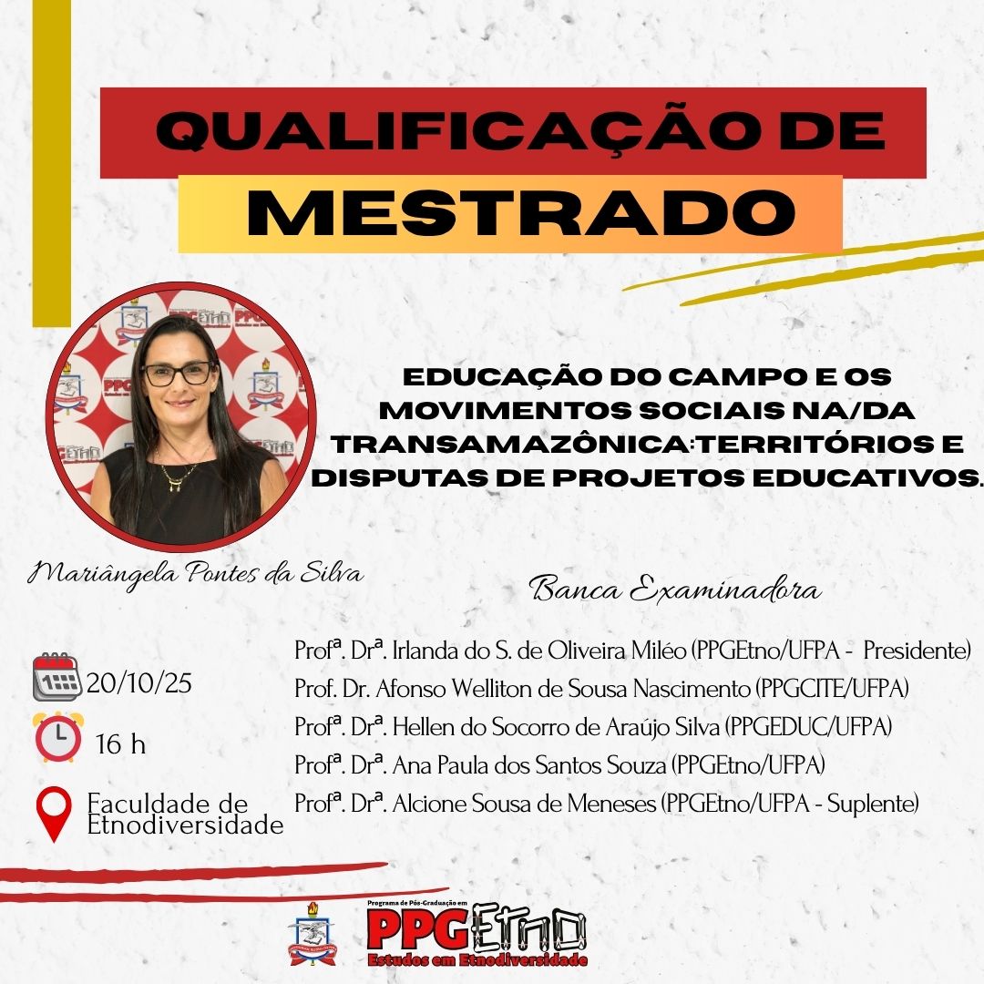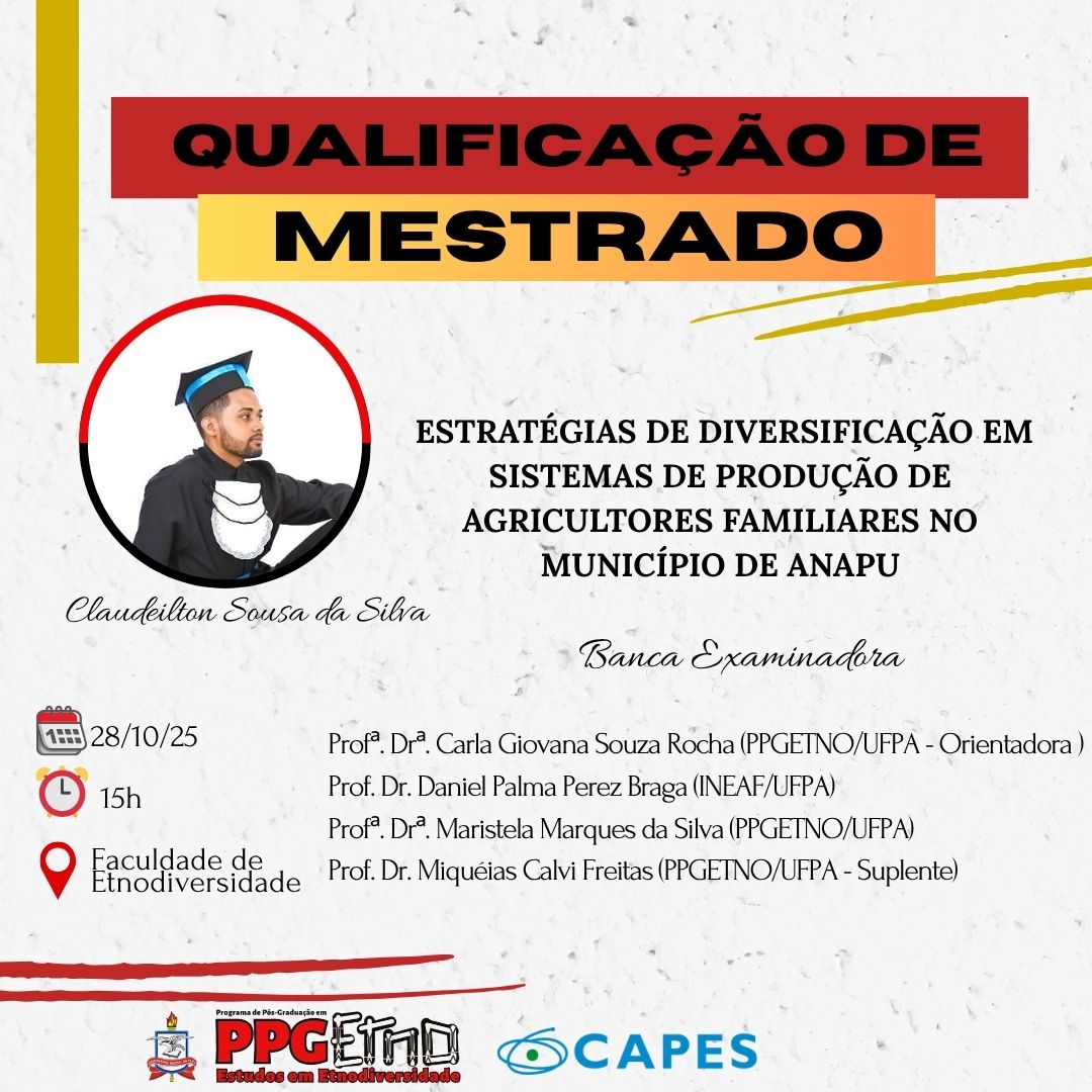 O Programa de Pós-Graduação em Estudos em Etnodiversidade (PPGEtno/UFPA) convida professores, pesquisadores, estudantes e a comunidade para participar da Qualificação de Mestrado intitulada: